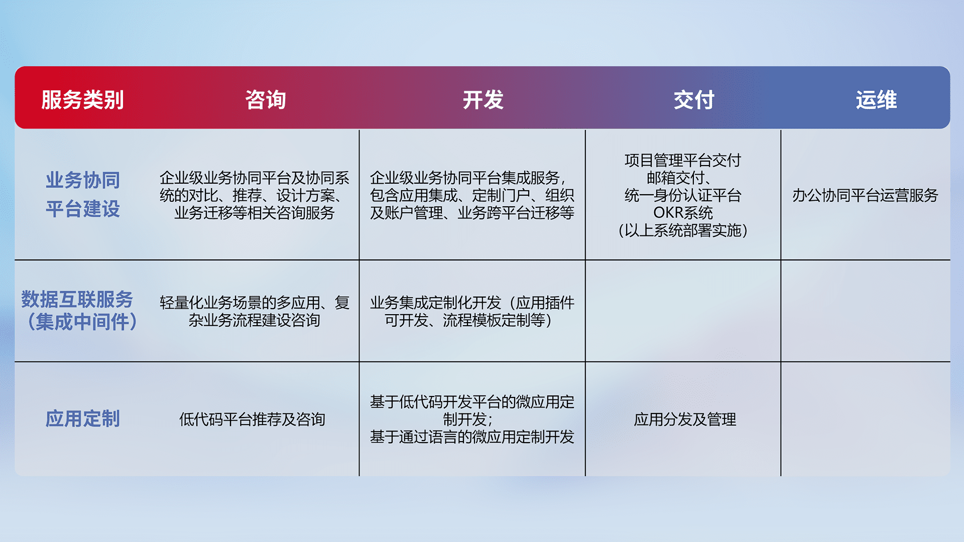 针对钉钉、、、、企微、、、、IDaas等平台级产品提供产品的规划、、、方案、、交付、、、、定制化开发等服务,,,,实现如统一协同办公、、、智能客户服务、、混合会议管理、、智能数据查询、、、、等业务场景,,,实现数字化转型。。。。